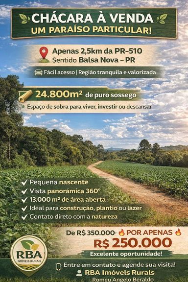Área 22.077,00 m² 30% eucalipto (colhido 2021) e 70% de mata exuberante com várias araucárias. Bela vista do rodeio santo Antônio e das áreas de açudes vizinhos, luz Copel na frente do imóvel, acesso pela Estrada Municipal João Maria Alves Ferreira. Cercada nos fundos com cerca de 5 fios de arrame e palanques de concreto. Área de mata excedente própria para compensação ambiental. Fica a 1,7 km do asfalto, (PR-510), Fabrica da Bizzinelli.