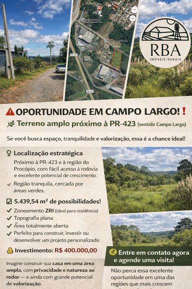 Terreno à Venda em Campo Largo – Próximo à PR-423 (sentido Campo Largo) 📍 Localização estratégica: Excelente terreno localizado em Campo Largo, próximo à PR-423 (sentido Campo Largo) e nas proximidades da região do Procópio. Fácil acesso à rodovia, ideal para quem busca praticidade e valorização. 📐 Características do imóvel: • Área total de 5.439,54 m² • Zoneamento: ZR1 (ideal para residência) • Área ampla e totalmente aberta • Topografia plana, facilitando construção • Região tranquila, com áreas verdes ao redor 💡 Ótima oportunidade para: ✔ Construção de residência ✔ Investimento imobiliário ✔ Projeto personalizado em região em crescimento 💰 Valor: R$ 430.000,00 Entre em contato para mais informações ou agendar uma visita. Excelente oportunidade em uma das regiões que mais cresce em Campo Largo!